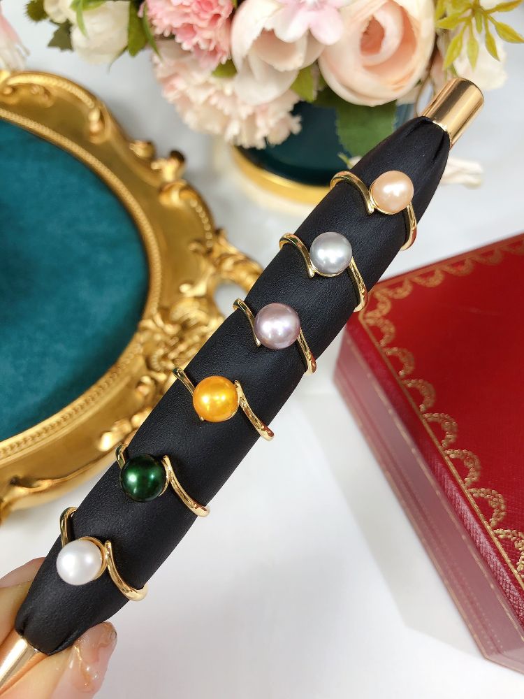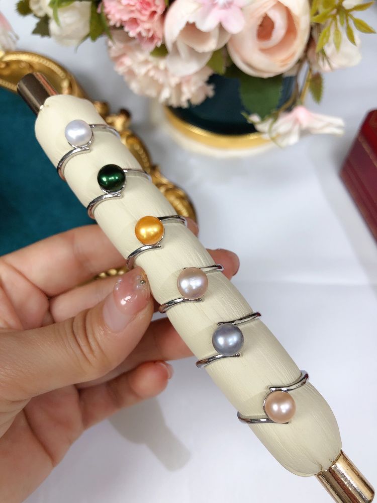 Natural freshwater pearls, 7-8mm in size. Gold, black, and gray colors are dyed, while all other colors are natural. Minor flaws.