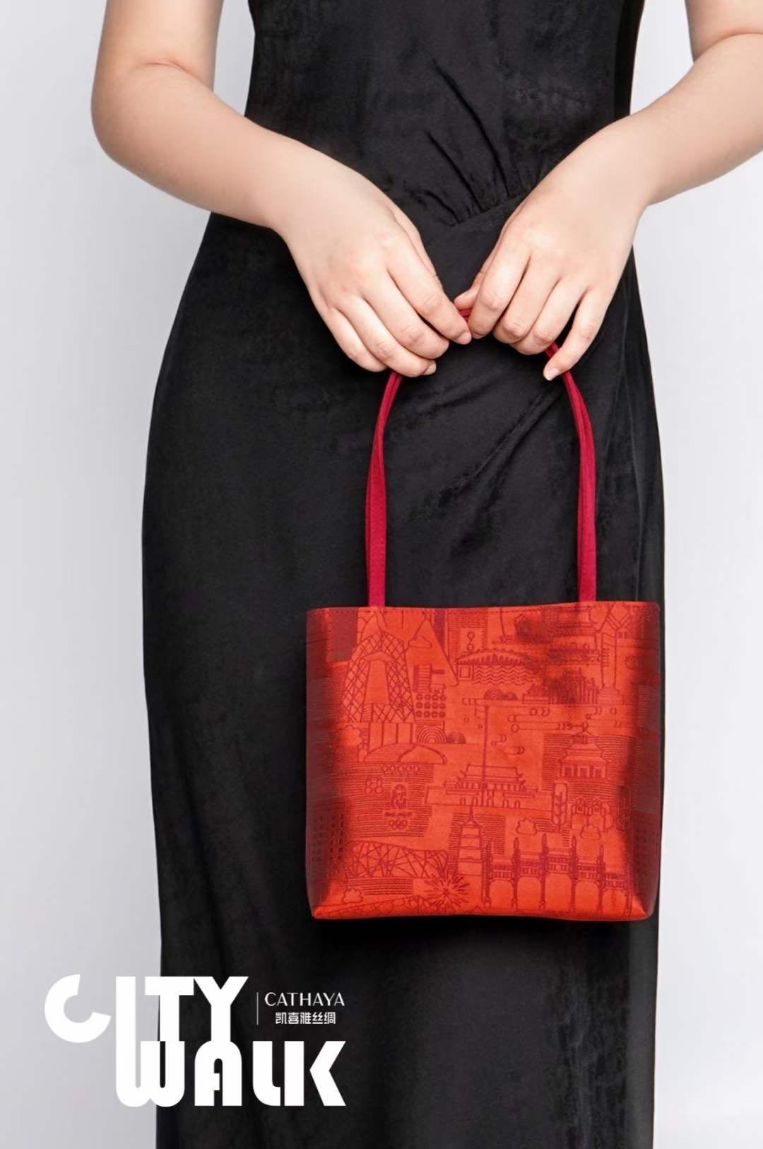 CITYWALK】 系列真丝手包 设计以丝绸之路上的城市—西安,北京,杭州,上海,广州为背景,用一种现代语言串联起来——City walk,是一种城市微旅游方式。包型款式休闲,即可手挎又可单肩背,是城市漫步的必备选择。 “让我看看你的城市面孔,我就能说出这个城市在追求什么文化”。每一个城市都以它不同的色调、形体与特色带给人们不同的感受。每款包都配有独特的城市颜色:北京—中国红,上海—霓虹紫,杭州—西子绿,西安—古都赭,广州—阳光黄。 此系列包承载了城市的历史和记忆,在这里能感受到城市的肌理、发展的脉络。 City walk—北京 设计元素:鸟巢,天安门,天坛,水立方,国家大剧院,央视大厦,奥运会logo,颐和园,白塔等标志性建筑。 颜色说明:“丹韵”引导的红色系寓意着喜庆庄重、热情忠诚,不仅是中国人最喜欢的颜色之一,也是中国最具标志性的色彩。厚重的红墙是古老北京的一张名片;作为新中国的首都,北京更是带有浓烈的红色印记;红色所代表的审美情感深深扎根北京市民心中。