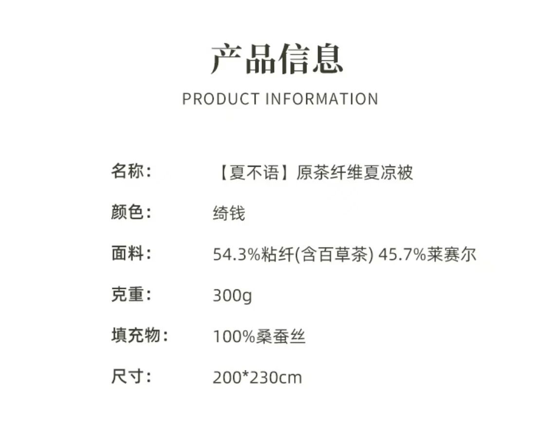 【夏不语】的答案: 融合天然茶多酚纤维面料与100%桑蚕丝填充,以天然材质的物理特性,打造更透气吸湿、温感舒适、亲肤柔和的睡眠微环境,助力安享清凉夏夜。